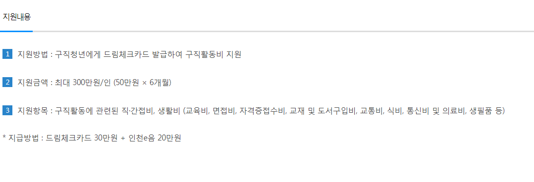 지원내용으로는 체크카드를 발급하여 구직활동비를 지원하고, 지원금액은 최대 300만원입니다.