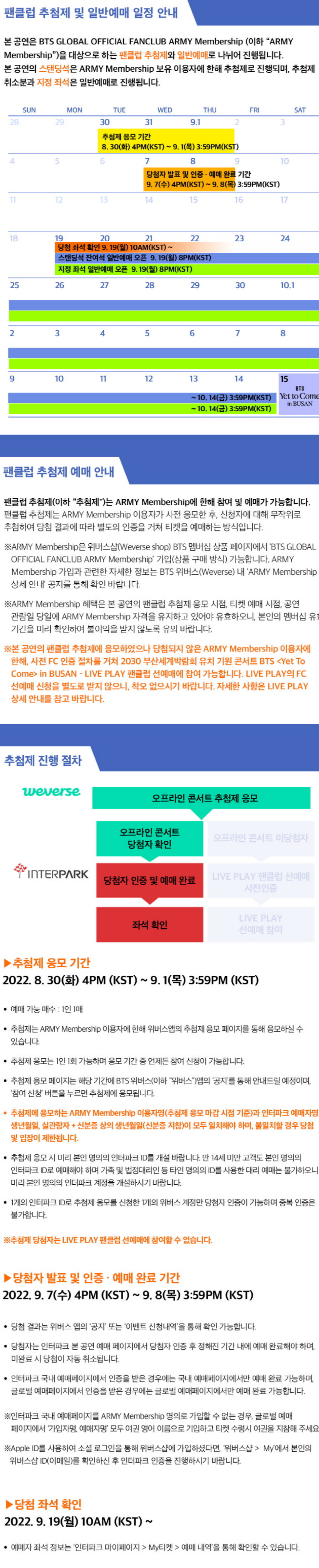 방탄소년단 부산 콘서트 티켓팅은 팬클럽 추첨제와 일반예매 일정으로 나뉘어져 있습니다. 위 사진을 잘 참고해보세요!