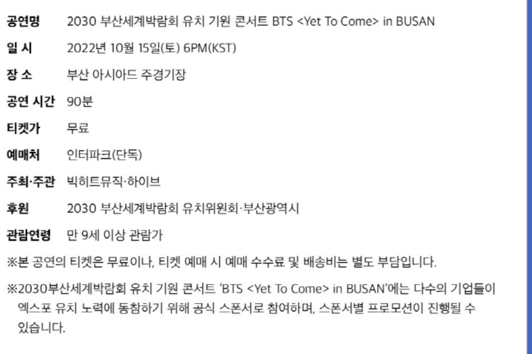 BTS 팬분들한테는 정말 좋은소식이죠. 바로 2030 부산엑스포 유치 콘서트로 방탄소년단의 공연을 합니다. 이번 부산엑스포 방탄 콘서트는 무료로 진행되기에 돈이 들지 않습니다! 이 소식에 벌써부터 많은 분들의 관심이 뜨거운데요.