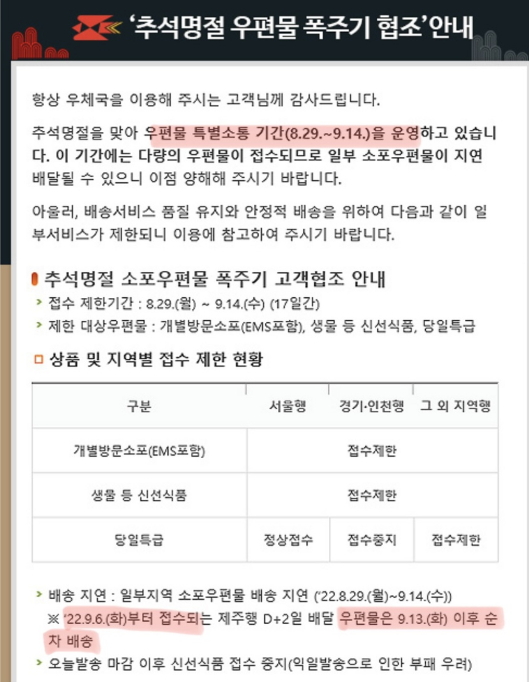 개인택배는 9/6~9/12일까지 제한됩니다.