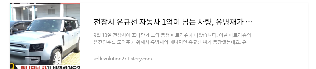 | 전참시 유규선 자동차 1억이 넘는 차량, 유병재가 선물한 이유는?! (0) | 2022.09.11 |