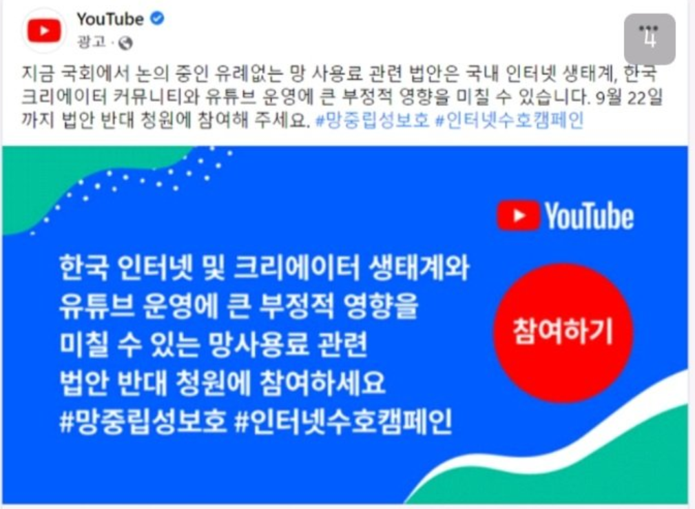 이에 유튜브는 법안 반대 청원 영상을 업로드하면서, 망 중립성을 지키자는 입장을 주장했습니다. 현재 이용료도 비싼데 앞으로 법안이 더해지면 이용료가 더 비싸지기 때문에, 사업 운영 방식을 바꿔야할수도 있다고 합니다.
