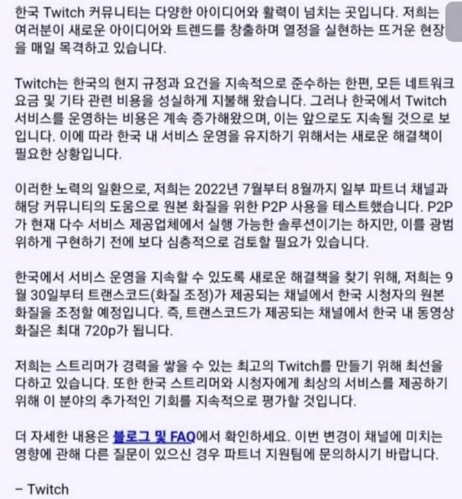 이번 공지에 트위치 공지에 따르면, 지금까지 한국 기준의 망 사용료를 내고 있었으나, 망사용료가 너무나 많은 비용이 들고, 앞으로 개정되는 망 사용료로 올라가는 천문학적인 비용 때문에 미리 720p로 조절했다는 것 입니다.