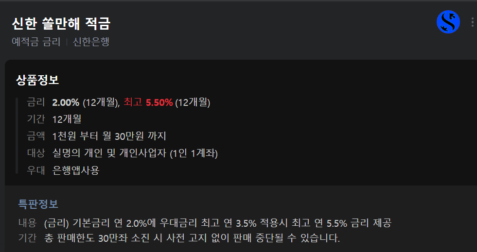 👉더 많은 신한은행 적금 목록(바로가기) |