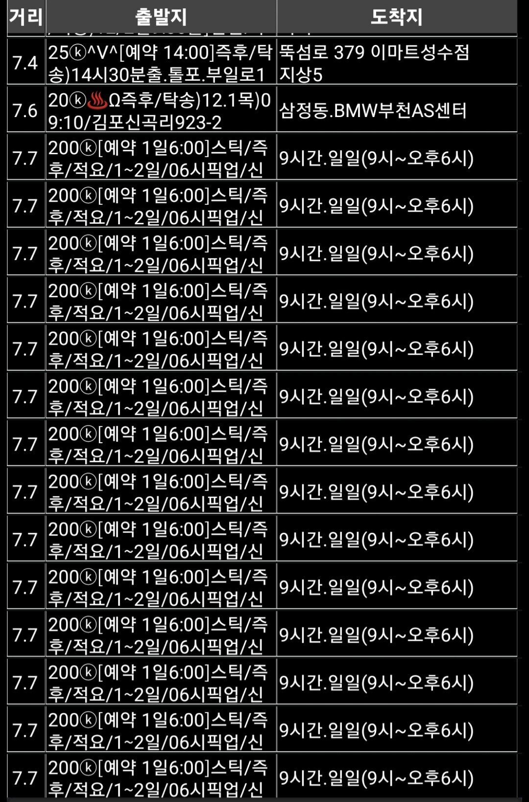 위의 사진이 대리프로그램에 올라온 콜입니다. 200k라고 되어있는 게 금액으로 즉 20만원이라는 뜻입니다.