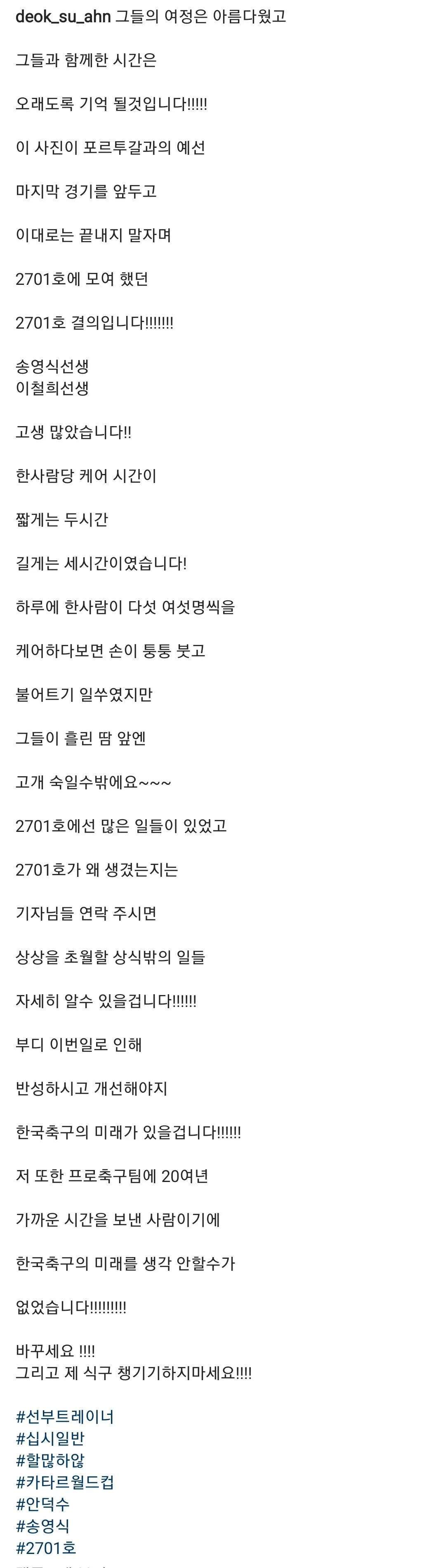 이번 카타르 월드컵에서 우리나라의 축구 국가대표팀 선수들의 관리를 해줬던 안덕수 트레이너가 인스타그램 스토리에 어떤 글을 남겼습니다.