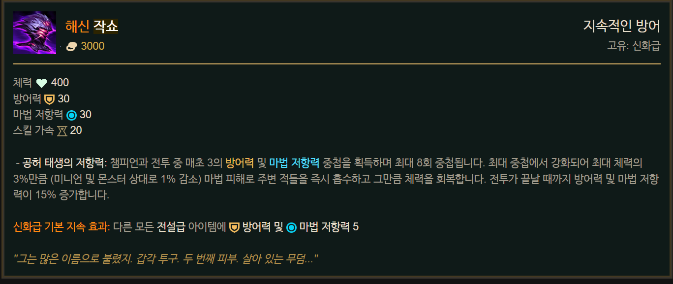 신규 탱커 신화템인 이케시아의 인내가 해신 작쇼라는 이름으로 바뀌었는데