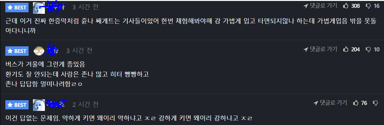 사람꽉찬곳에서 히터틀면 숨막혀 죽겠다.
