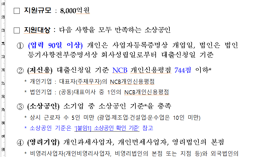 신청대상 저신용 ncb 744점이하 소상공인이 대상
