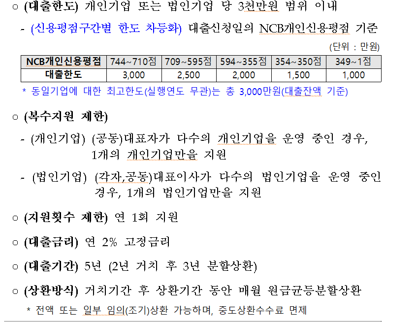 ✅ 공단에서 성공불융자 ‘고의실패’ 판정을 받은 업체 또는 해당업체의 대표자(대표이사)가 운영하는 기업(법인 포함)은 판정일로부터향후 3년간 대출신청 제한 2. 공단에서 대출사고기업으로 관리 중인 업체 또는 해당업체의 대표자(대표이사)가 운영하는 기업(법인 포함) |
