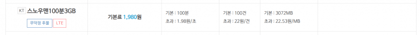 기본료 1,980원 , 기본 100분, 초과 1,980원/초