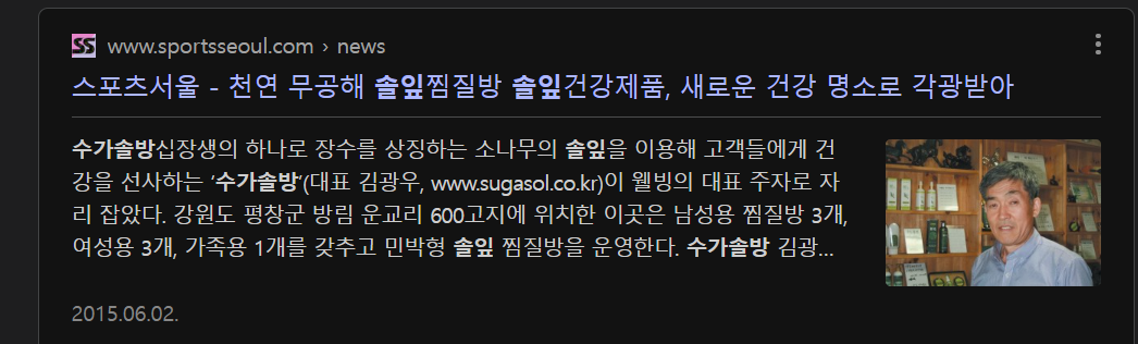 수가솔방이라는 곳으로, 600고지 소나무 숲 속에 위치해 있다고 합니다. 많은 나무들이 있는 숲 속에 위치한 찜질방이어서 도시에서의 퀘퀘한 공기와는 반대로 신선한 공기! 평소 사우나와는 사이가 멀었던 분들도 즐기실 수 있으며 따스함이 뼈 속까지 깊숙히 느껴지며 힐링장소 라고 합니다!