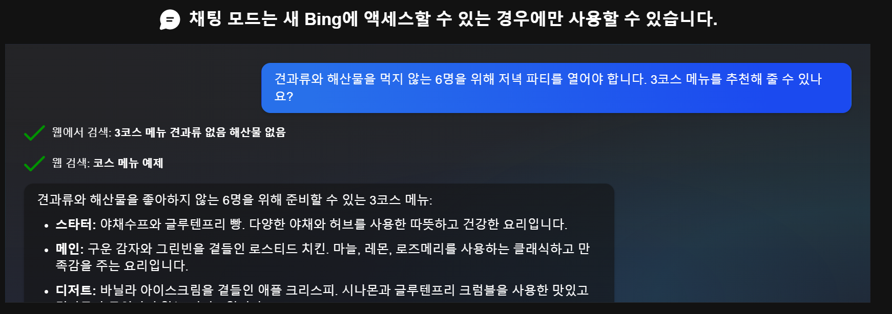 인터넷과 연결되어 있어선지 ChatGPT와 같은 대화(Chat) 모드 외에 검색(Search) 모드까지 총 두 개의 모드가 존재한다. 따라서 빙 챗에서 #Search를 입력하고 질문하면 검색 모드로 답변해주고 #Chat를 입력하고 질문하면 ChatGPT와 같은 답변이 나온다.