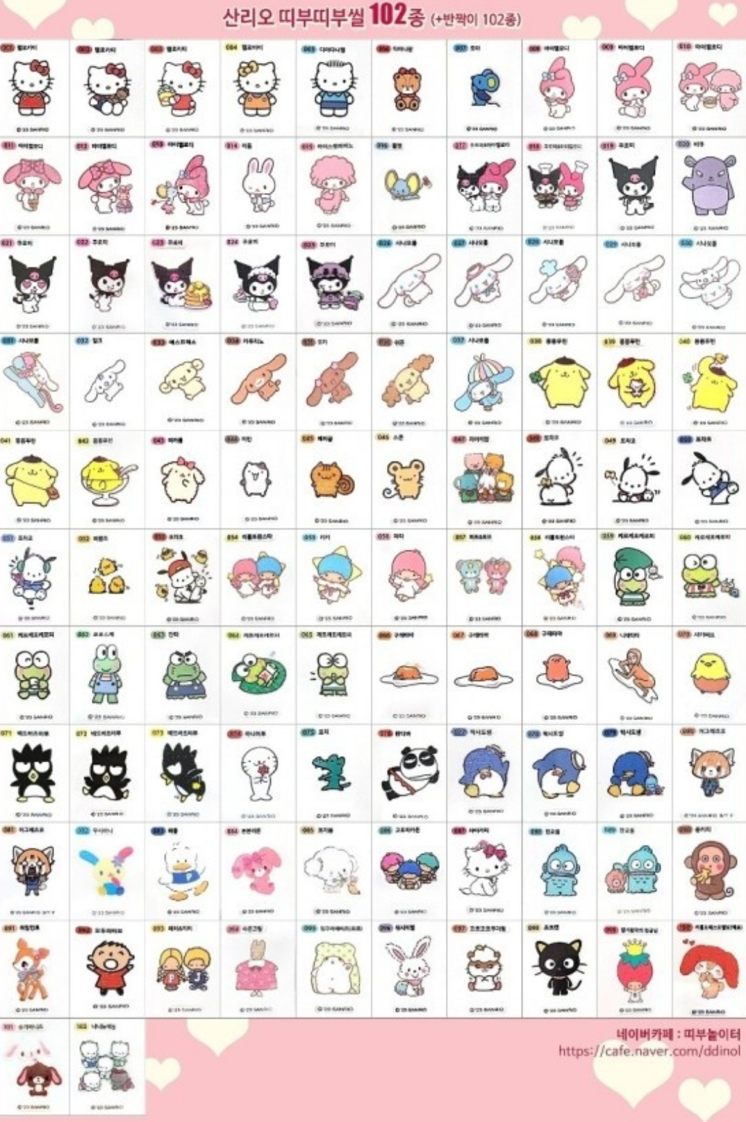 산리오빵안에는 띠부씰이 랜덤으로 1장이 있습니다. 근데 보면은 2개?가 나오는 경우도 있더라구요. 띠부씰의 종류는 총 102종인데, 일반 띠부씰과 반짝이 띠부씰이 따로 있습니다. 왜 둘로 나눴는지 이해가 잘...