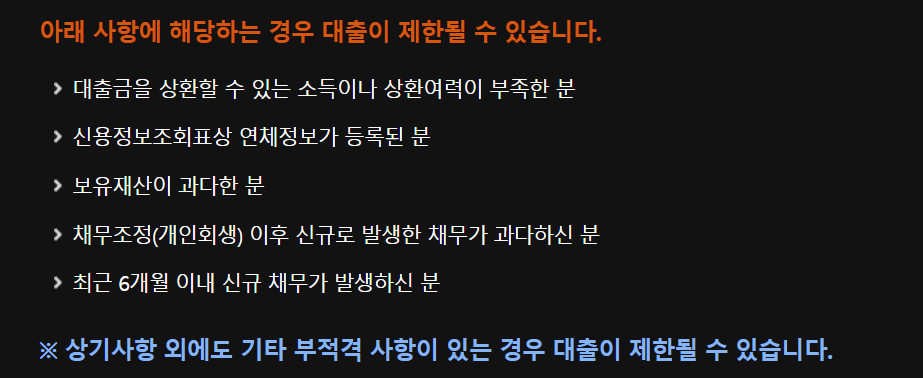 대출금 상환할 수 있는 소득이 없는 사람, 연체가 아직 있는 사람, 보유재산 조건이 부적절한 사람, 채무조정 이후 새롭게 채무가 생긴 사람 등은 대출을 받을 수 없습니다. 이외에도 다른 이유로 조건이 부합할 수 있습니다.