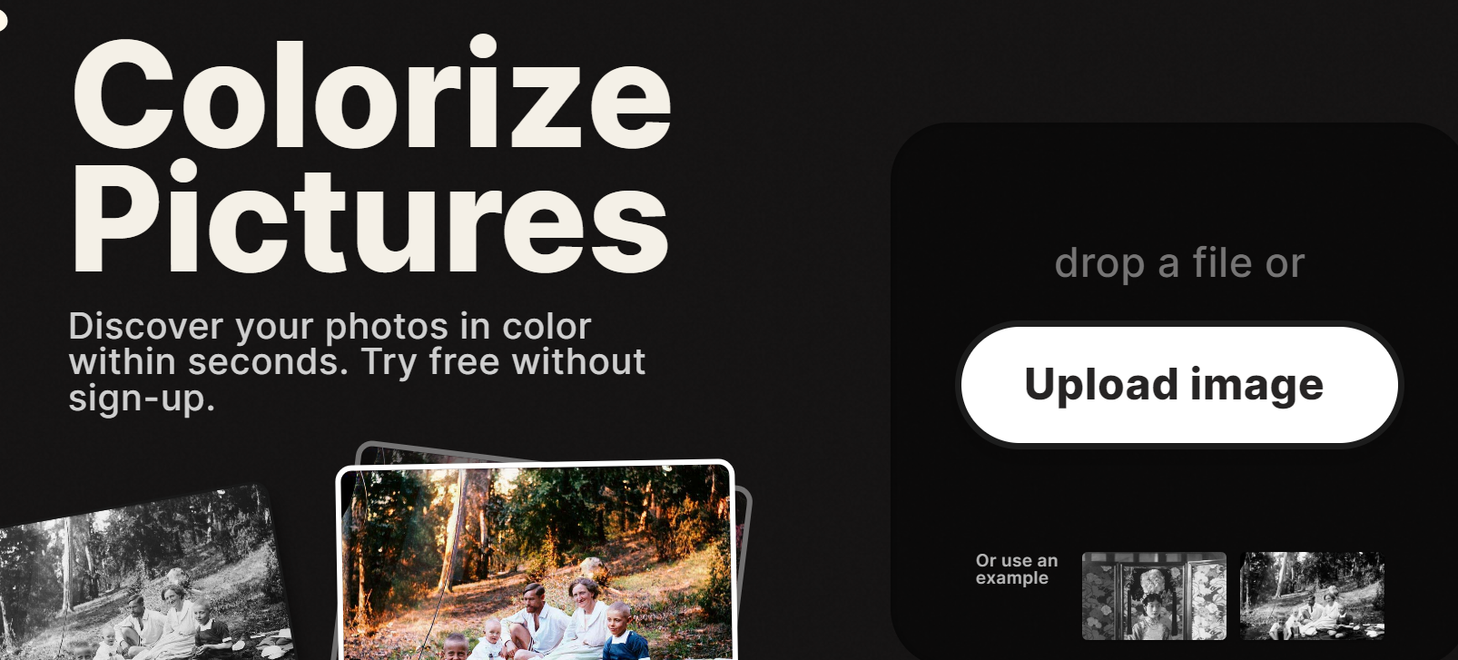 흑백 사진을 드래그 앤 드랍하여 업로드하면 자동으로 컬러로 채워집니다.